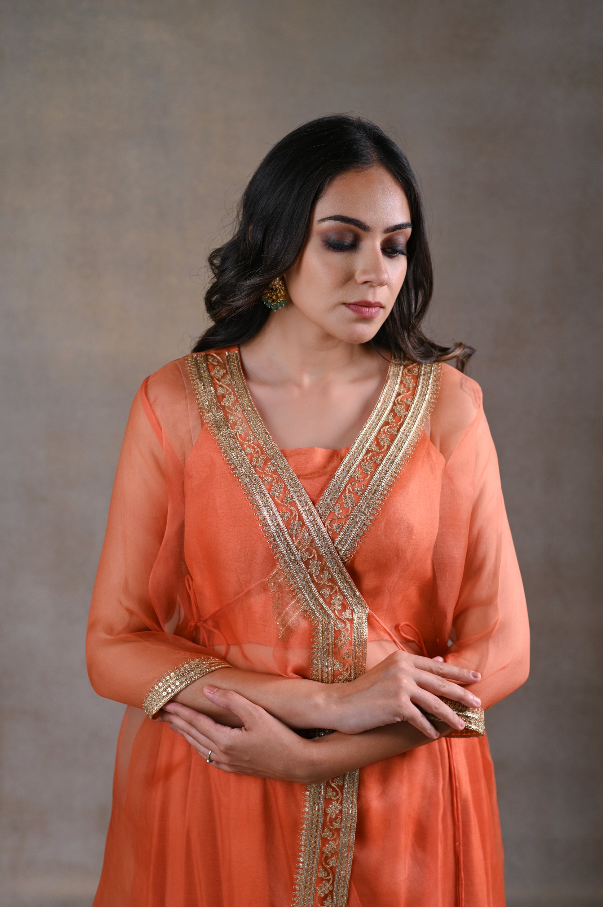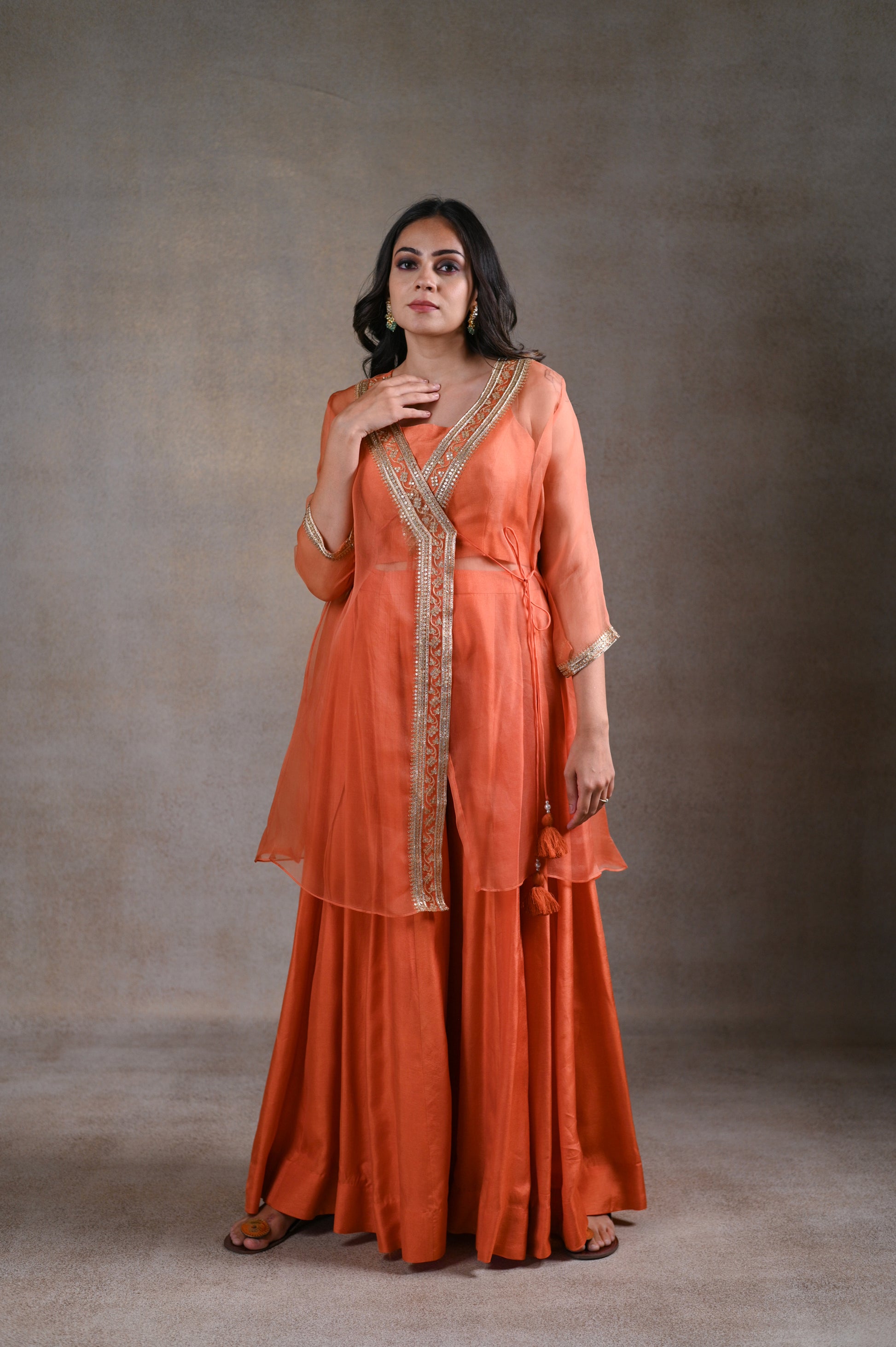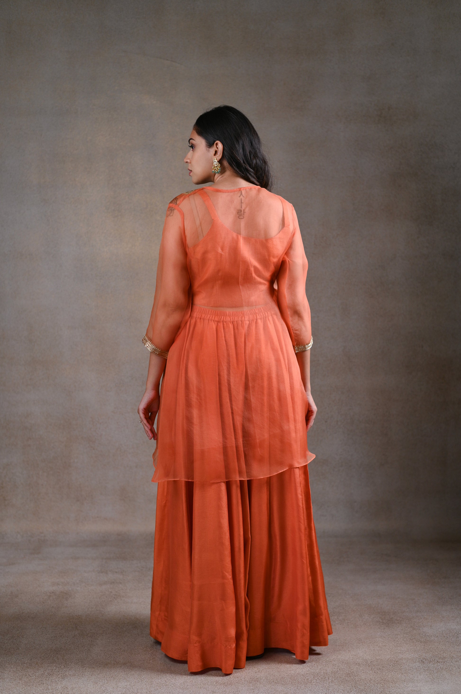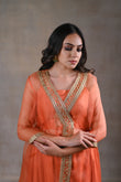 Handcrafted Organza peplum set with aari, zardosi, tikki & moti work paired with detailed silk plazo