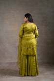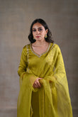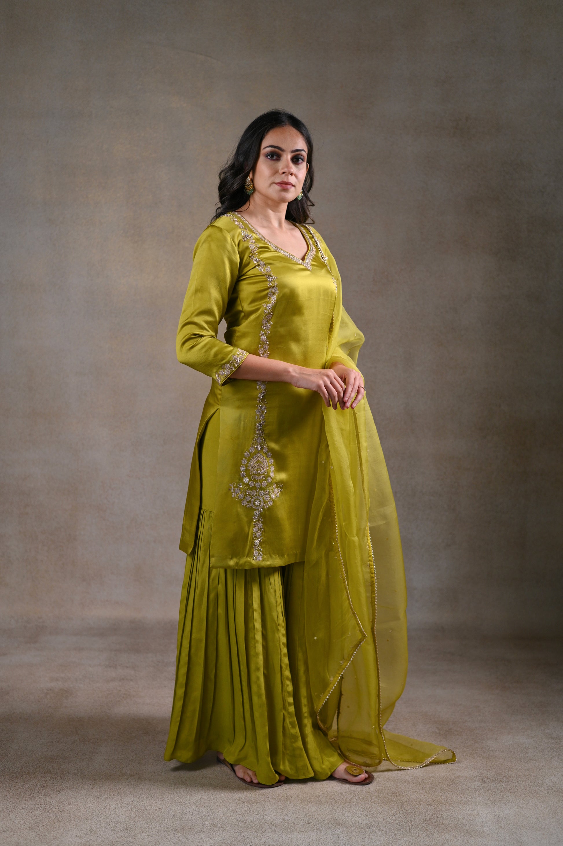 Handcrafted Organza kurta set set with aari, zardosi, tikki & moti work paired with silk pants and bustier